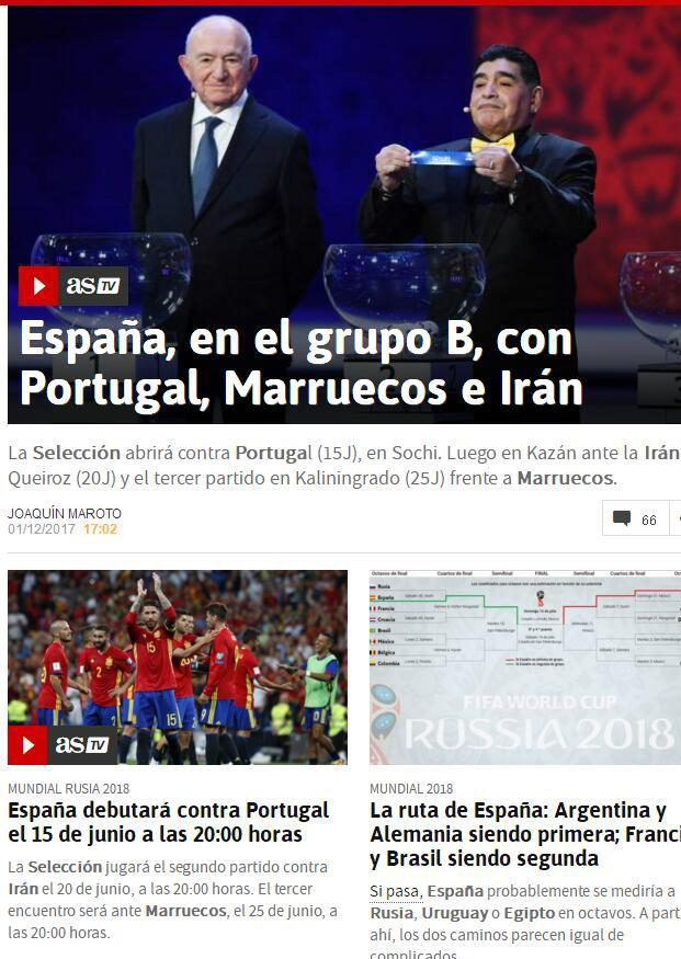 西班牙,与葡萄牙、摩洛哥和伊朗分在了B组。此外,《阿斯报》还设计了西班牙的晋级路线:获得小组头名可能会遇到阿根廷和德国,获得第二则会遇到法国和巴西。