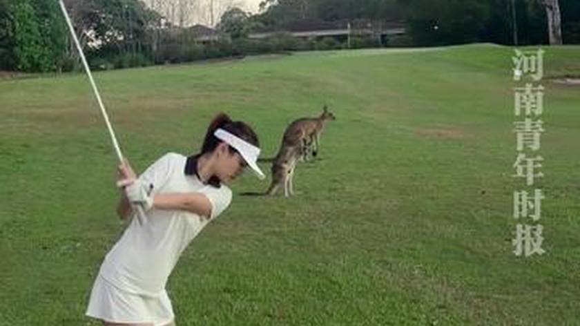 女生打高尔夫球击中袋鼠下盘,袋鼠疼得直往远处跳,网友:球技不错,就是有点费袋鼠