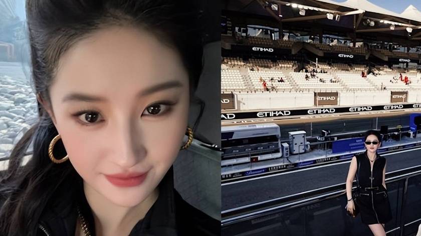刘亦菲现身阿布扎F1赛车现场,穿一身名牌,妆容精致,颈纹很明显