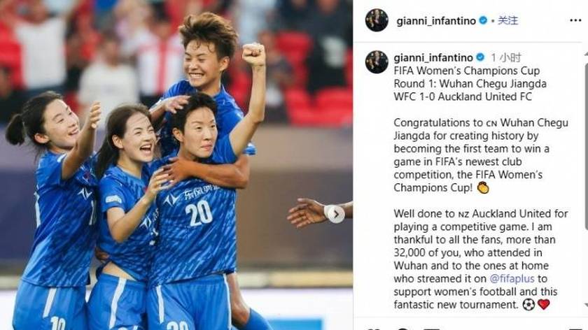 武汉女足创历史,国际足联主席发文